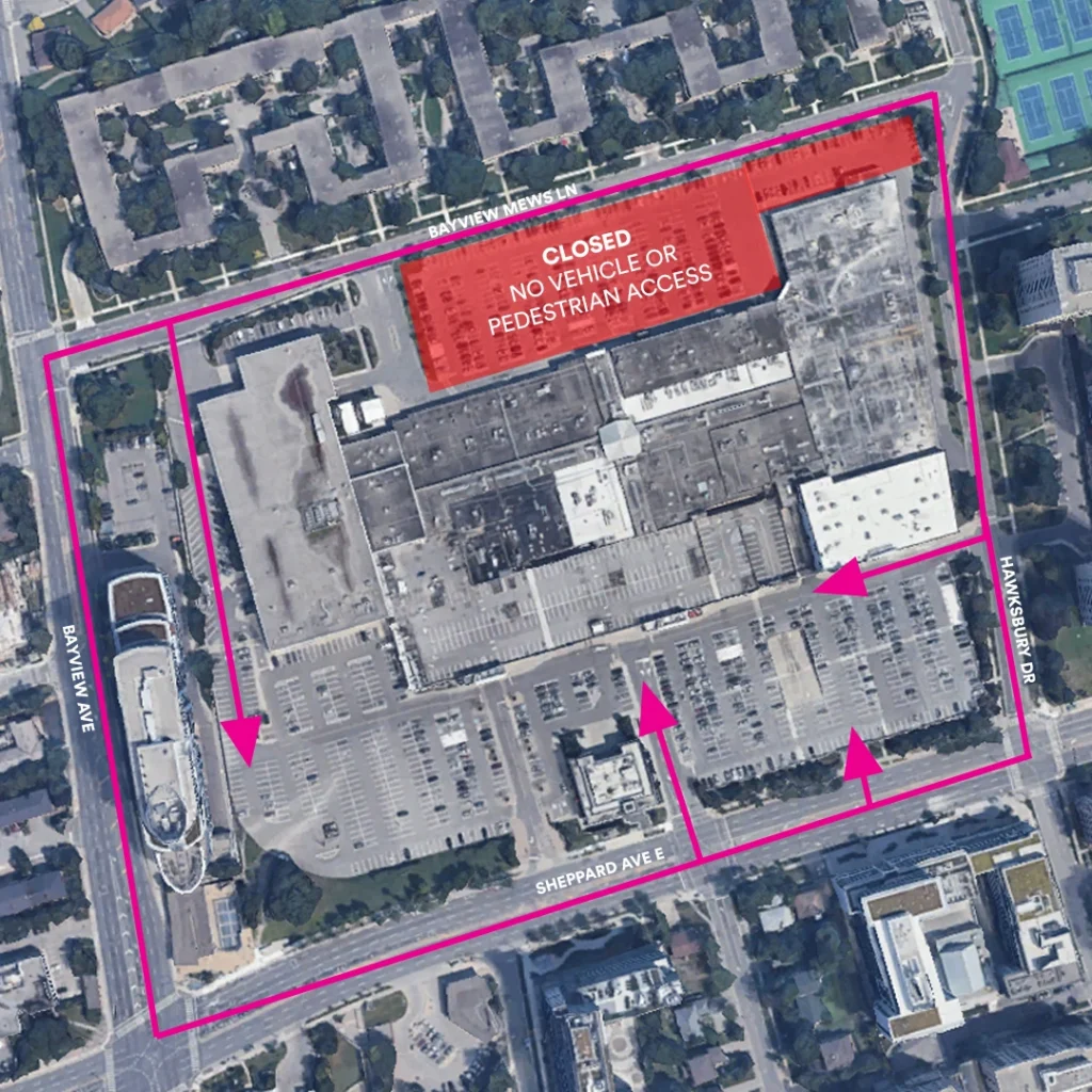 No direct access to the shopping centre from Bayview Avenue. Turn east onto Sheppard Avenue E.